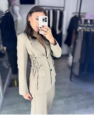 - Detalji: bočni korset vezovi na sakou koji oblikuju struk; rever kragna; dva prednja džepa s preklopom; diskretne vertikalne pruge koje izdužuju siluetu.