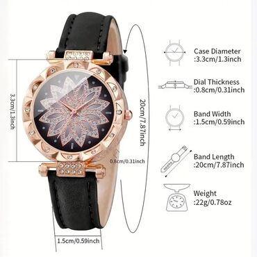 Ističe se luksuznim izgledom: kombinacija ružičasto zlatnog kućišta i crnog kaiša sa blistavim detaljima na ciferu u obliku cveta. Pogodan za svakodnevno nošenje i svečane prilike, lako se uklapa uz narukvice i drugi nakit. Lagana konstrukcija obezbeđuje udobno celodnevno nošenje.