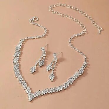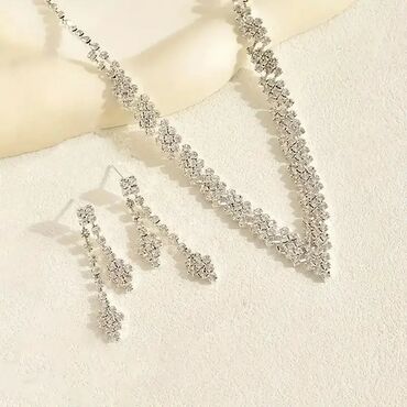 - Dizajn: V‑oblikovana ogrlica sa gusto postavljenim sjajnim kristalima u nizu, koji formiraju bogat cvetni/geomterijski motiv. Dugačke viseće minđuše u tri segmenta prate isti motiv i stvaraju skladan, svečan komplet.