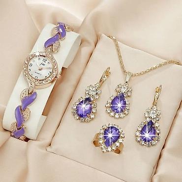 - Sadržaj seta: ženski ručni sat + ogrlica sa priveškom, par minđuša i prsten.