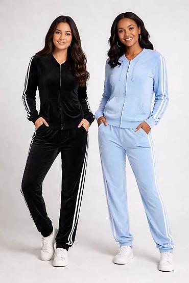 Komplet obuhvata gornji i donji deo u istoj boji sa sportskim prugama.