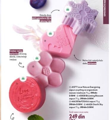 Set mirisnih sapuna – 75 g svaki - Love Nature Energising sapun za piling sa organskom nanom i malinom (šifra 41277). Blagi piling za osveženje kože; sitne čestice maline uklanjaju nečistoće, ment...