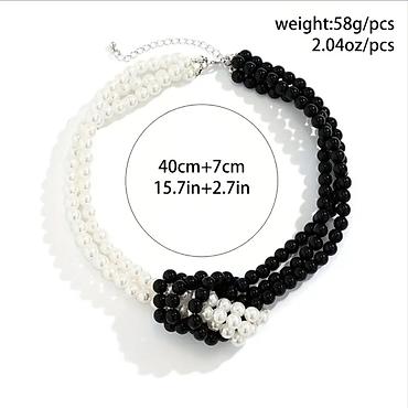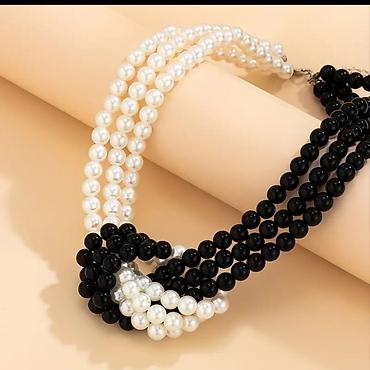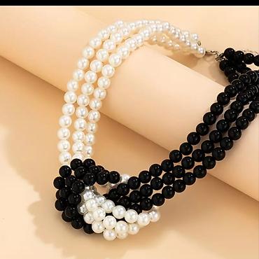 - Dizajn: Četvorostruki niz bisernih perli u kontrastu crna + bela, dekorativno upleteni čvor kao fokus.
