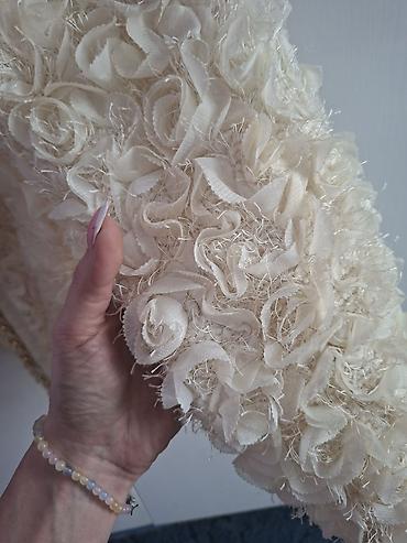- Materijal: spoljašnji deo prekriven trodimenzionalnim aplikacijama u obliku cvetnih rozetni od šifona/satenskih traka i finih resica; unutrašnjost glatko postavljena podstavom