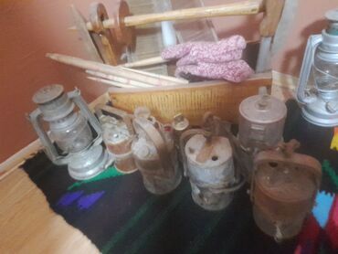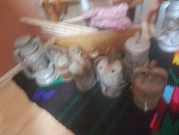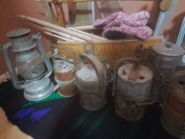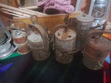 - Više komada metalnih rudarskih lampi sa ručkama i kukama za kačenje; cilindrična tela, poklopci sa otvorima i mehanizmima za dotok vazduha/goriva.