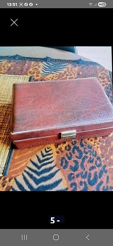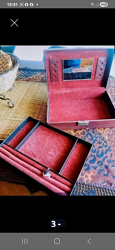 - Materijal: spolja presvučena kožnom imitacijom u braon boji; unutrašnjost obložena mekim baršunom u bordo/ crvenoj nijansi.