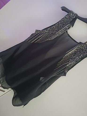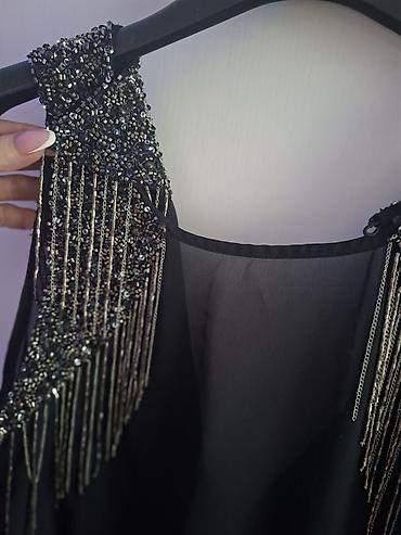 - Detalji: bogato ukrašena ramena i izrez rukava crnim i srebrnim perlama, šljokicama i metalnim resama/lančićima koji padaju niz ramena i grudi