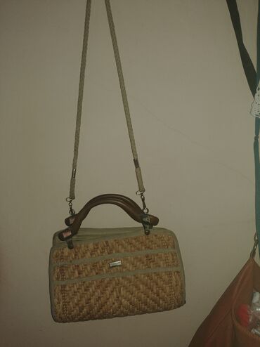 - Pletena crossbody/ručna torbica: telo od pletene teksture u prirodnoj bež boji, bočni i gornji rubovi od platna; drvene ručke tamne boje sa metalnim okovima; duga pletena kaiš-traka koja se kači karabinima; gornji rajsferšlus.