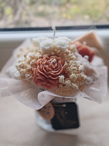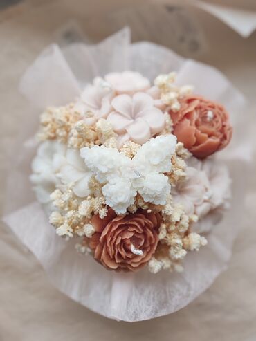- Ručno rađena sveća oblikovana kao raskošan buket: reljefne ruže u terakota nijansi, svetloružičasti cvetovi i detalji od sitnog “punog” cveća.