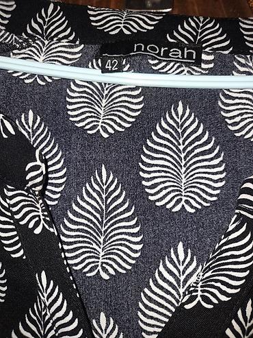 Ženska bluza Norah, veličina 42. Crna podloga sa belim listićima u celoprekošnom printu. Model sa V-izrezom i kratkim oklopljenim kopčanjem napred, blago opušten kroj koji lepo pada preko kukova. Rukavi se mogu podvrnuti i pričvrstiti trakicom za ležerniji izgled. Prijatna, meka tkanina pogodna za svakodnevno nošenje i lako kombinovanje uz farmerke ili elegantne pantalone. Dizajn sa listovima daje efektan, ali nenametljiv izgled. Marka: norah. Veličina na etiketi: 42.