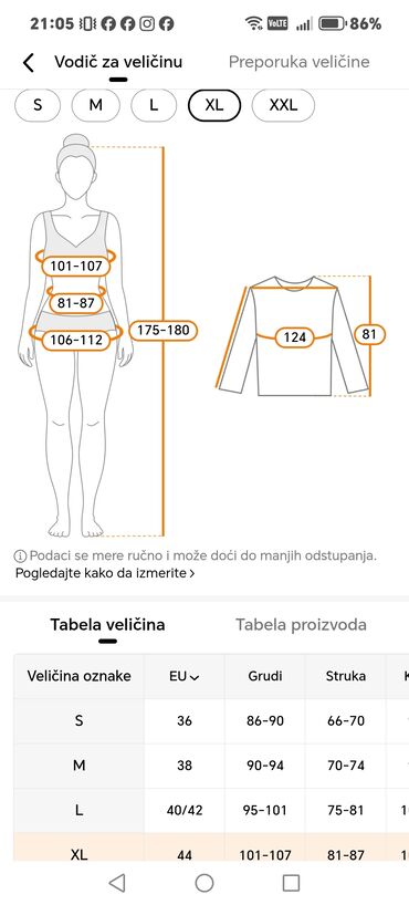 - Na fotografiji prikazan vodič za veličinu (S–XXL). Primer za XL: grudi 101–107 cm, struk 81–87 cm, kukovi 106–112 cm, obim preko grudi 124 cm, dužina rukava oko 81 cm.