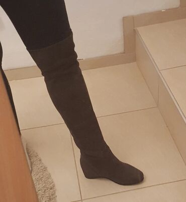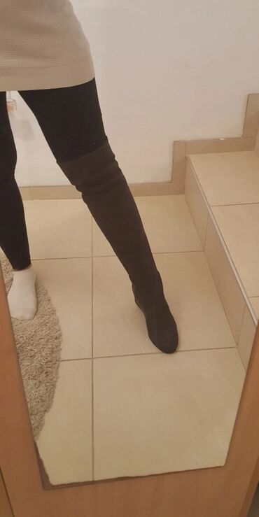 Preko kolenaCrne ženske čizme preko kolena (over-the-knee), od mekog materijala sličnog brušenoj koži/antilopu. Model sa skrivenom punom petom (wedge), stabilnom i udobnom za svakodnevno nošenje. Zaobljen vrh, elastična sarevica koja lepo prijanja uz nogu i pruža elegantnu liniju. Gumeni đon sa profilom za bolje prianjanje. Klasičan, minimalistički dizajn – lako se kombinuju uz helanke, farmerke ili haljine. Boja: crna. Visina iznad kolena. Idealne za jesen/zimu i gradske kombinacije...kao nove..jednom nosene..br..38..24cm..udobne i ne padaju na dole dok hodate..