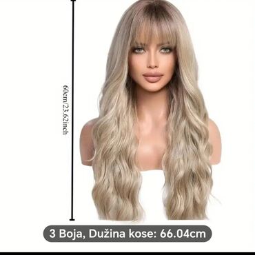- LC259-1: dužina 55,88 cm. Blond nijansa sa blagim “shadow root” efektom (tamniji koren), slojevito šišana sa zavjesa-šiškama (curtain bangs) za prirodan pad oko lica.
