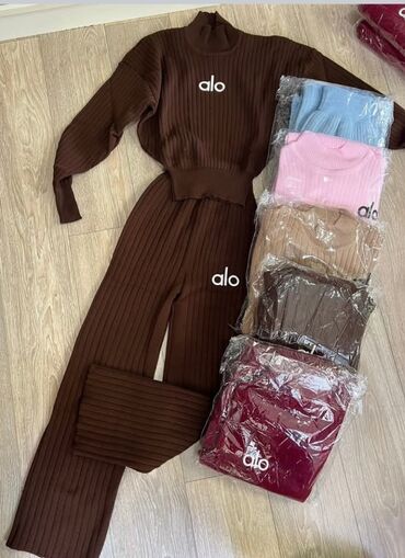 - Model 2: rebrasti “alo” komplet sa polurol-kragnom i širokim pojasom, ravne rebraste pantalone. Prikazane boje: tamno braon, svetloplava, roze, bež, čokoladno braon i bordo, sa kontrastnim “alo” logotipom.