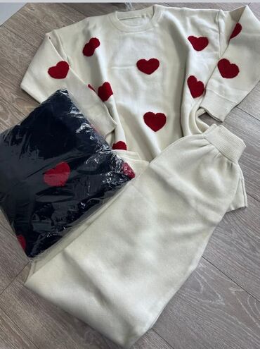 Ženski pleteni komplet – džemper i pantalone sa širokim nogavicama. - Gornji deo: mekani pleteni džemper sa okruglim izrezom i dužim rukavima. Dekorisan motivima – bele srcolike aplikacije ili sit...