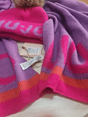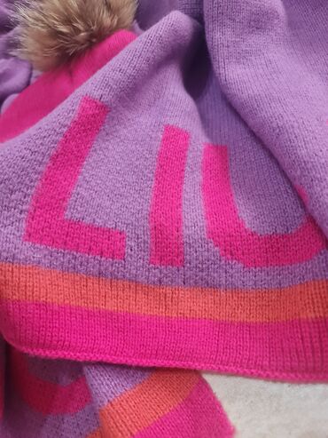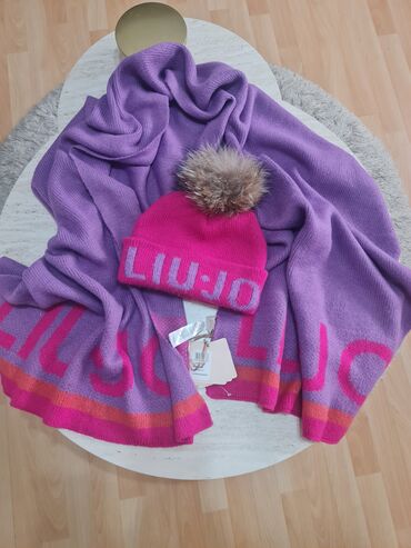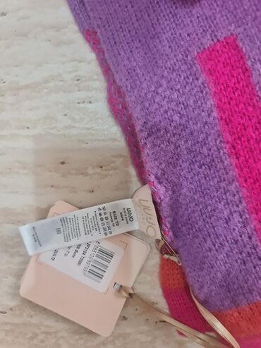 - Šal širok i mekan, dominantno lila, sa kontrastnim rubovima u fuksija i narandžastoj nijansi i velikim utkanim LIU•JO natpisom.