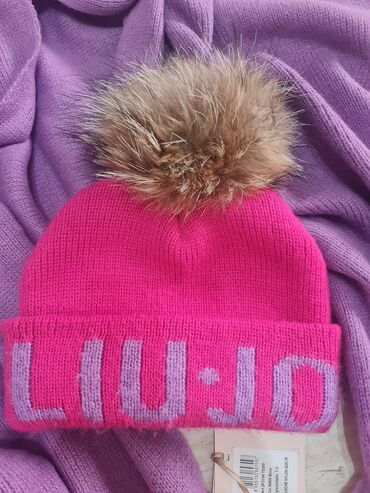 - Kapa u fuksija roze boji sa velikim pufnastim pomponom u prirodnoj braon nijansi. Po obodu je utkan prepoznatljiv LIU•JO logo u lila boji.