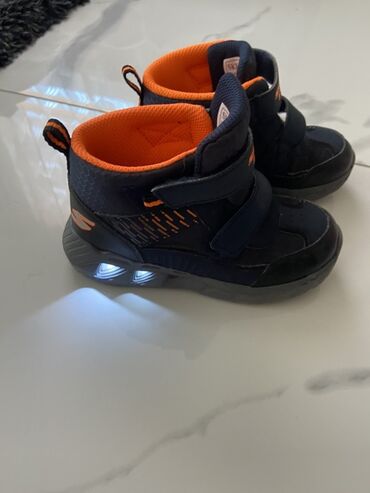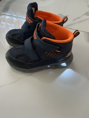 CrnaDečije Skechers S-Lights čizme u tamnoplavoj boji sa narandžastim detaljima. Poseduju svetleće đonove koji se aktiviraju prilikom hoda. Kopčanje je na dve čičak trake, što omogućava lako obuvanje i izuvanje, kao i prilagođavanje širine. Idealne za svakodnevne aktivnosti i igru, pružajući udobnost i zabavu. Gornji deo je teksturni sa glatkim površinama, a petlja na zadnjoj strani olakšava navlačenje.
