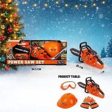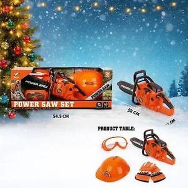 - U kompletu: igračka motorna testera, zaštitne naočare, šlem i rukavice.