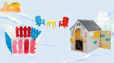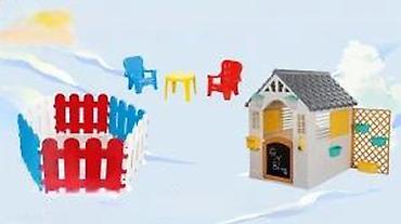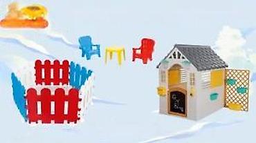 - Dečju kućicu visine 127 cm sa: tablom za crtanje na vratima, zvoncem, saksijama/žardinjerama sa bočne strane i prozorima sa kapcima.