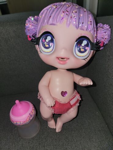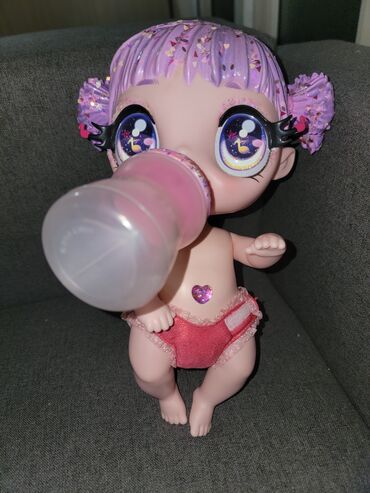 ŠarenoVelika lutka beba sa ljubičastom kosom i šljokicama, krupnim sjajnim očima i trepavicama u crnoj boji. Na stomaku ima srcoliku nalepnicu/ukras koji svetluca. Dolazi sa roze platnenom pelenom sa čičak-zatvaranjem i velikom flašicom sa roze cuclom i muzičkim notama na prstenu. Fleksibilne ruke i noge omogućavaju sedenje i različite poze; može da drži flašicu u ustima. Dimenzije približno: 25–30 cm visine (procena sa fotografija). Idealna za igru uloga brige o bebi i maštovite igre.