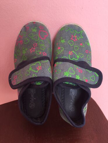 Dečije patofne/papuce TODOR, veličina 28. - Boja i dizajn: tamnoplava platnena površina sa šarenim printom (jednorog, oblaci, srca, dugine boje), ružičasti obrubi i đon. - Kopčanje: čičak traka...+381 64 22838xx