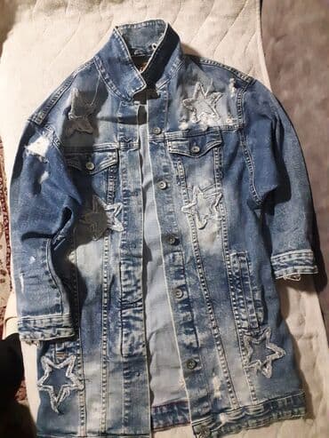 Džins jakna – dugi model sa izbleđenim efektom i dekorativnim zvezdama - Materijal: klasičan denim (pamučni teksas) - Kroj: produženi/oversized stil, dužina preko kukova - Zatvaranje: metalni dugm...