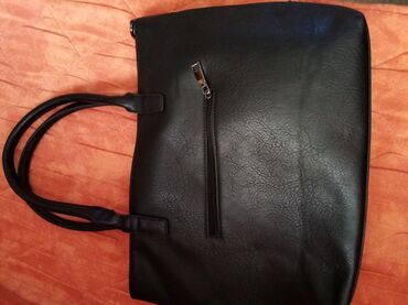 Crna torba – shopper/tote stil - Materijal: veštačka koža u crnoj boji sa blagim sjajem - Dizajn: strukturirana forma sa naglašenim šavovima, prednji mali džep sa rajsferšlusom i metalnim klizačem...