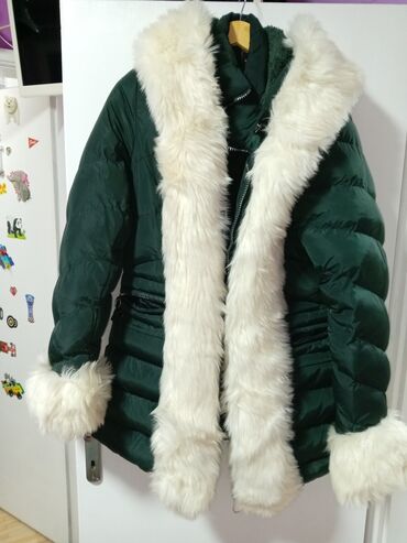 Zimska ženska jakna, tamnozelena, sa bogatim detaljima od bele veštačke krzne.