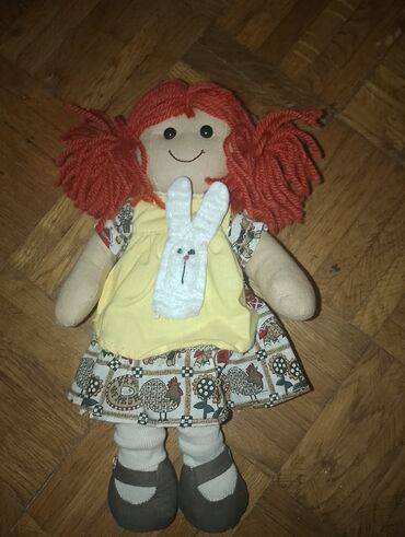 2) Crvenokosa lutka u šarenoj haljini sa žutim keceljcem i malom belom plišanom zečicom prišivenom napred; bele čarapice i sive cipelice