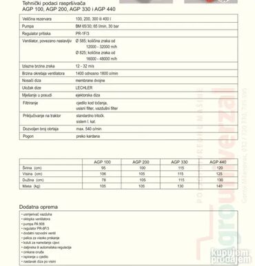 Atomizer Agromehanika AGP – Inovacija za Efikasnu Zaštitu Voćnjaka i Vinograda Savremeni Agromehanika AGP atomizeri predstavljaju vrhunsku tehnologiju u zaštiti voćnjaka i vinograda, kombinujući očuvanje životne sredine sa visokom efikasnošću u primeni preparata za zaštitu bilja. Ključne Karakteristike: Ekološka Zaštita: Osigurava očuvanje životne sredine kroz preciznu i ravnomernu primenu zaštitnih sredstava. Visoka Efikasnost: Napredna tehnologija omogućava kvalitetnu primenu preparata, čime se poboljšava zdravlje vaših kultura. Modeli u Ponudi: AGP 100AGP 200 AGP 330AGP 440Svaki model je dizajniran da zadovolji specifične potrebe vašeg voćnjaka ili vinograda, pružajući optimalne rezultate u zaštiti i nezi biljaka. Za dodatne informacije i nabavku, kontaktirajte nas na . AGP 200 dvoklipna pumpa 1950e AGP 330 1980e AGP 440 2020e AGP 200 tn 2960e
