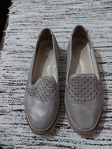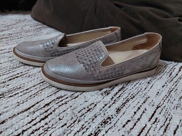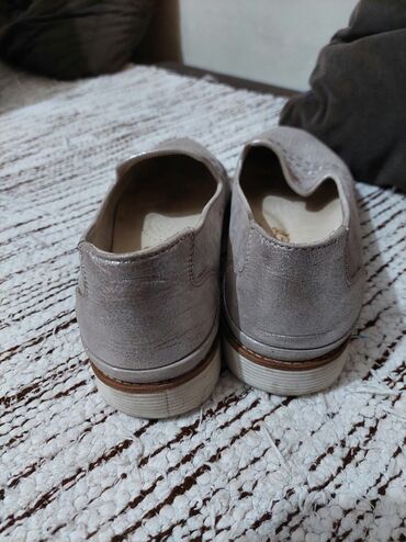 Srebrno-sive.Gaziste je kozno.Ima ulozak sa jastucicima.Tako da su preudobne.Stanje odlicno.