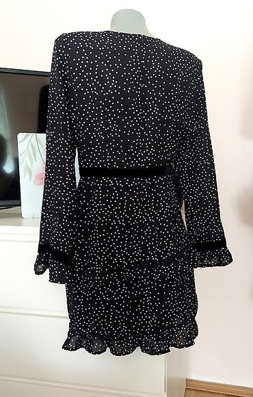 Haljina na preklop sa printom u crno-belim tačkama. - Kroj: midi dužina, struk naglašen kaišem u istom materijalu; gornji deo na preklop sa reverima. - Rukavi: kratki, blago široki. - Kopčanje: sk...