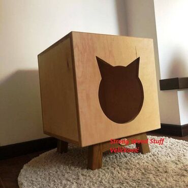 Drvena kućica za mačke, dizajnirana u obliku kocke, pruža udobno skrovište i mesto za odmor za vašeg ljubimca. Izrađena od svetlog drveta, kućica ima prednji otvor u obliku mačje glave, što doprinosi estetskoj privlačnosti i omogućava lak ulazak i izlazak. Postavljena je na četiri niske drvene nogice, koje je blago podižu od poda, obezbeđujući stabilnost i izolaciju. Njen kompaktan dizajn čini je pogodnom za smeštanje u različitim prostorijama, nudeći mački siguran i topao kutak. Idealna je za mačke koje vole da imaju sopstveni prostor za opuštanje i spavanje.