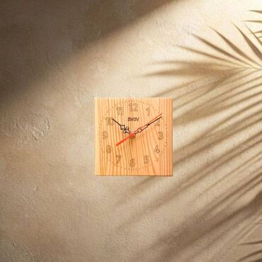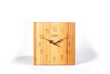 Drveni stoni sat u prirodnoj boji drveta. Kvadratnog je oblika, sa jasno urezanim brojevima i oznakama za sate i minute na prednjoj strani. Kazaljke su crne, dok je sekundara crvena, što omogućava laku i brzu proveru vremena. Dizajniran je da stoji samostalno na ravnoj površini, čineći ga pogodnim za upotrebu u kancelariji, na noćnom ormariću ili kao dekorativni element u dnevnoj sobi. Njegov prirodni izgled lako se uklapa u različite stilove enterijera, od modernog do rustičnog.