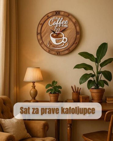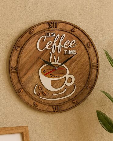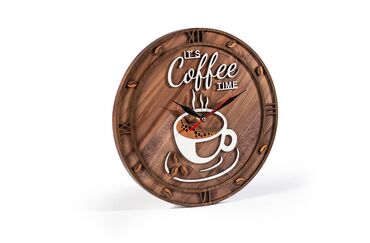 Zidni sat sa temom kafe, napravljen od drveta. Dizajn sata uključuje reljefnu ilustraciju šolje kafe i natpis "IT'S Coffee Time", što ga čini idealnim dodatkom za kuhinje, trpezarije ili kafiće. Sat ima klasične rimske brojeve za oznaku sati i ukrašen je detaljima u obliku zrna kafe. Prikladan je za ljubitelje kafe i dekoraciju prostora.