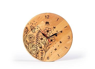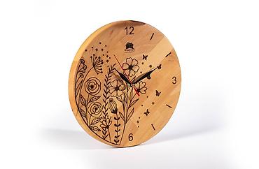 Ovaj okrugli drveni zidni sat ističe se prelepom floralnom gravurom