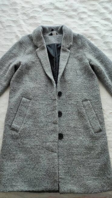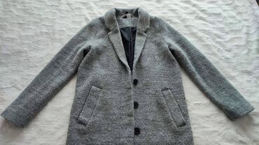 Ženska elegantna kaput-jakna u svetlosivoj boji sa modernim detaljima: - Asimetrično preklapanje napred sa kosim, vidljivim rajsfešlusom u crnoj boji - Široka, mekana kragna koja se može nositi spu...