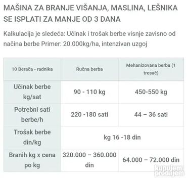 Olakšajte berbu uz naš tresac plodova koji je savršen za branje višanja, maslina, lešnika, šljiva i sličnih plodova. Ova mašina omogućava branje do 6000 kg voća dnevno, uz efikasnost od 90-95%. Zamislite, pet puta brže i pet puta jeftinije!