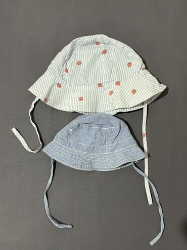 - Dva lagana letnja šeširića sa vezicama za vezivanje ispod brade: jedan svetloplavo-beli sa sitnim prugama i printom jagodica, drugi jednobojni svetlodenim. Mekani, prozračni, pružaju dodatnu zaštitu glave i lica od sunca.