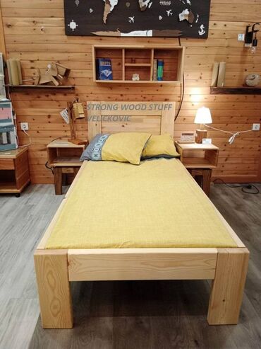 Napomena: Na fotografijama su prikazani i drugi elementi od punog drveta (plakari, radni sto, zidne police) u istom stilu – moguće uklapanje u komplet.