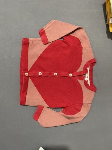 - Pleteni kardigan u dve nijanse crvene/ružičaste, sa dugim rukavima. Prednje kopčanje dugmićima.