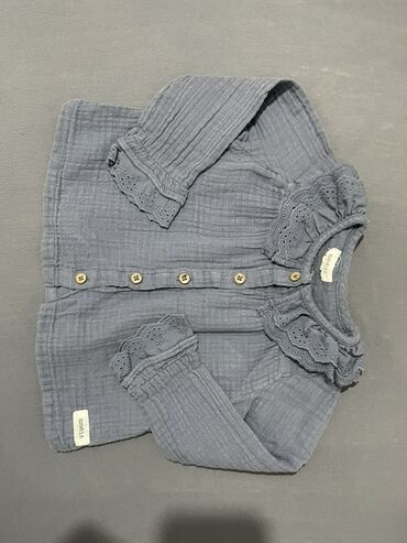 - Romper/body od muslina u sivo-plavoj boji, sa dugim rukavima. Dekorativna pamučna čipka na okovratniku i manžetnama, drvena dugmad napred i kopčanje između nogica. Mekan i prozračan materijal.