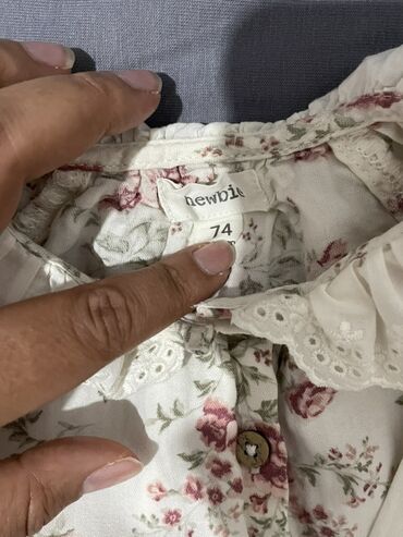 - Romper/body sa dugim rukavima u krem boji sa sitnim cvetnim printom u ružičastim tonovima. Rukavi i okovratnik ukrašeni pamučnom čipkom. Kopčanje napred drvenim dugmićima i između nogica za lako presvlačenje. Materijal lagan i nežan, idealan za svakodnevno nošenje.
