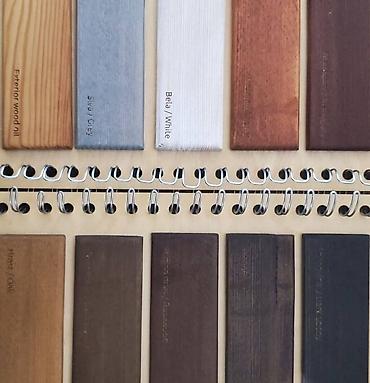 - Završna obrada: glatko brušeno, zaštićeno premazima za drvo. Na fotografiji prikazan spektar mogućih tonova/bajceva (svetle, sive, bele i tamne nijanse).