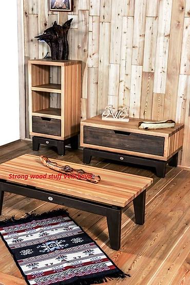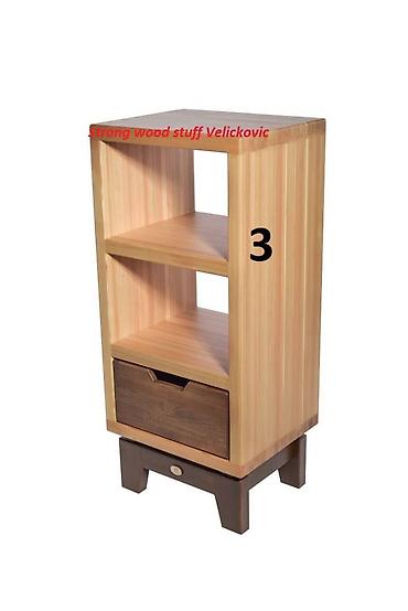 - Materijal: masivno drvo sa izraženom prirodnom šarom; kombinacija svetlijeg korpusa i tamnijih elemenata (fioka i nogare).