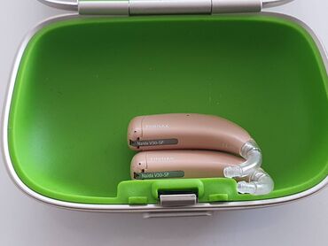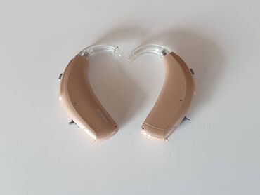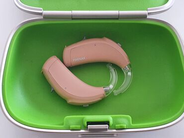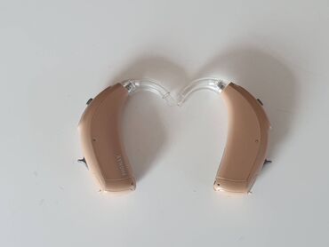 Bernafon slušni aparati – komplet - Model: iza-uva (BTE) slušni aparati, brend Bernafon - U kompletu: dva aparata (leva i desna strana) sa ušnim kukama i providnim individualnim umecima, tvrda zaš...