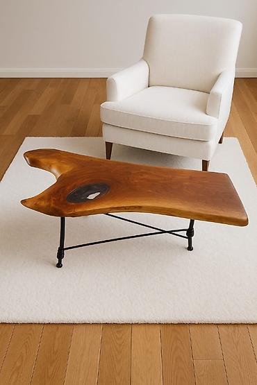 Ploča stola je napravljena od nepravilne daske oraha sa tri strane koje zadržavaju prirodne ivice, naglašavajući organsku lepotu drveta.