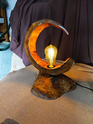 - Dizajn: skulpturalni „polumesec“ na stabilnom drvenom postolju; dekorativna Edison sijalica postavljena u centru kompozicije