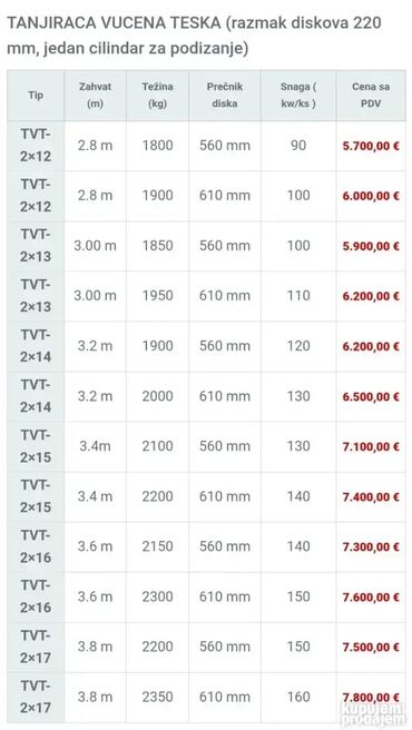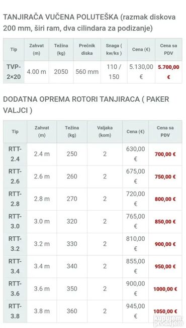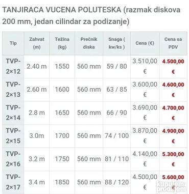 TANJIRAČA VUČENA FEROCOOPTanjirače vucene poluteske tipa "V" namenjene su za tanjiranje pooraonog zemljišta pred setvu, ali se uspešno mogu koristiti i za ljuštenje strnjišta, usitnjavanje žetvenih ostataka, kao i za zaoravanje stajskog đubriva. Konstrukcija ovih tanjirača omogućava dobro prodiranje u dubinu zemljišta na ravnim terenima. Glavne karakteristike: Konstrukcija: Izrađena od čeličnih cevi, profila i limova dimenzija 150x150x5 mm. Ram sa obešenim radnim baterijama. Diski: Prečnik diska: 560 mm. Izrađeni od visoko legiranog čelika, poboljšani za otpornost na habanje. Uležištenje: Kotrljajući valjkasti ležajevi. Liveno kućište sa dva valjkasta ležaja po uležištenju. Zaštita: Svi elementi zaštićeni su sa dva premaza temeljnom bojom i lakom. Dodatna oprema: Rotori tanjirača tzv. paker valjci. Doplata za dva cilindra za podizanje (preporučuje se za tanjirače sa rotorima od 2 x 15): 200,00 € Kontakt: Za više informacija ili narudžbine, kontaktirajte nas na: Telefon: 065/456-5063